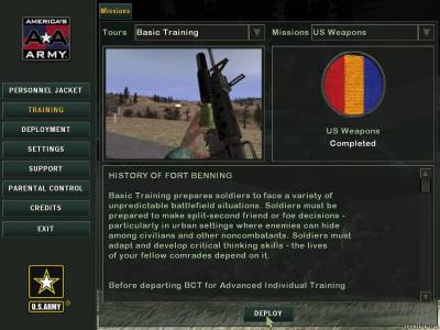 Ты прошел стрельбише и полосу препятствий. Теперь тебе пора познакомиться с основными видами вооружения с которыми тебе прийдется столкнутся в бою. В меню тренинга выбираем закладку "US Weapons" и жмем кнопку "DEPLOY" как показано на рисунке